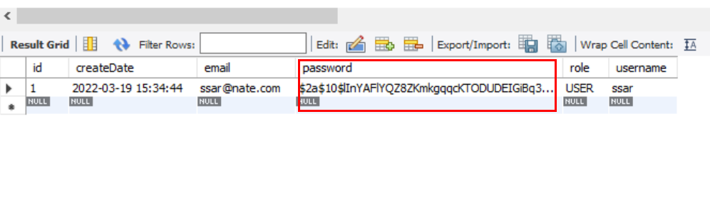 4. DB를 초기화하고 다시 회원가입을 해보면 해쉬화된 비밀번호가 잘 들어간 것을 확인할 수 있다.