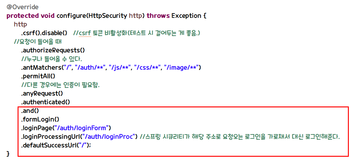 6.SecurityConfig 코드를 아래와 같이 수정하면 위의 form태그에 걸어놓은 /auth/loginProc 주소를 UserApiController에 따로 매핑해줄 필요가 없다.