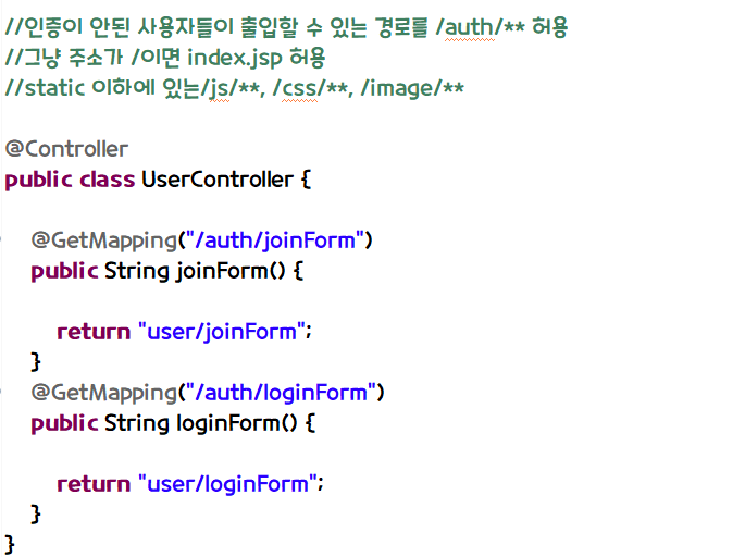 1. 인증이 안 된 사용자들이 출입할 수 있는 /auth/ 경로를 UserController에 추가해 준다.