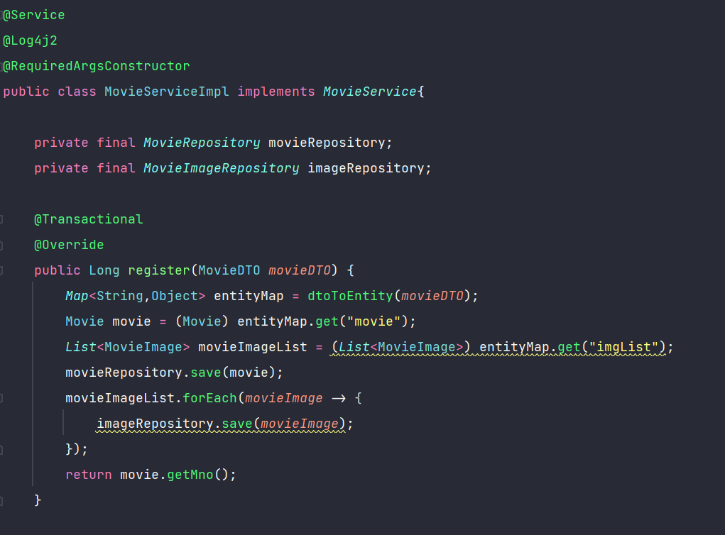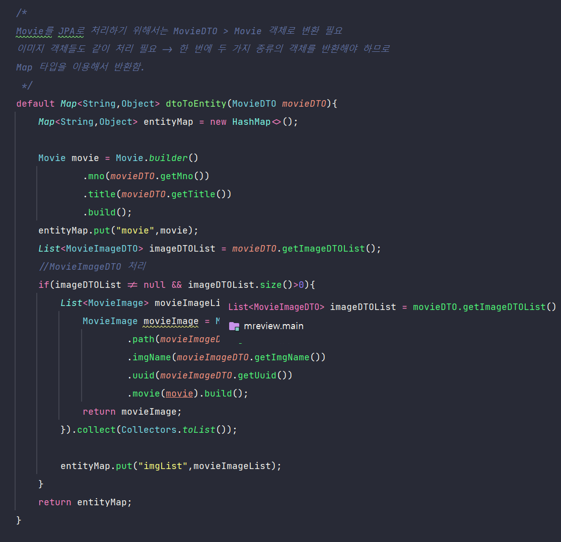 - 여기에서는 이전 프로젝트와 달리 Movie, MovieImage 객체도 같이 처리해야 하기 때문에 한번에 두 가지 객체를 반환하기 위해 Map 타입을 이용함.