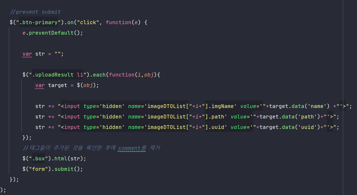 - 히든 태그에는 imageDTOList[0]과 같이 인덱스 번호를 붙여서 처리함.