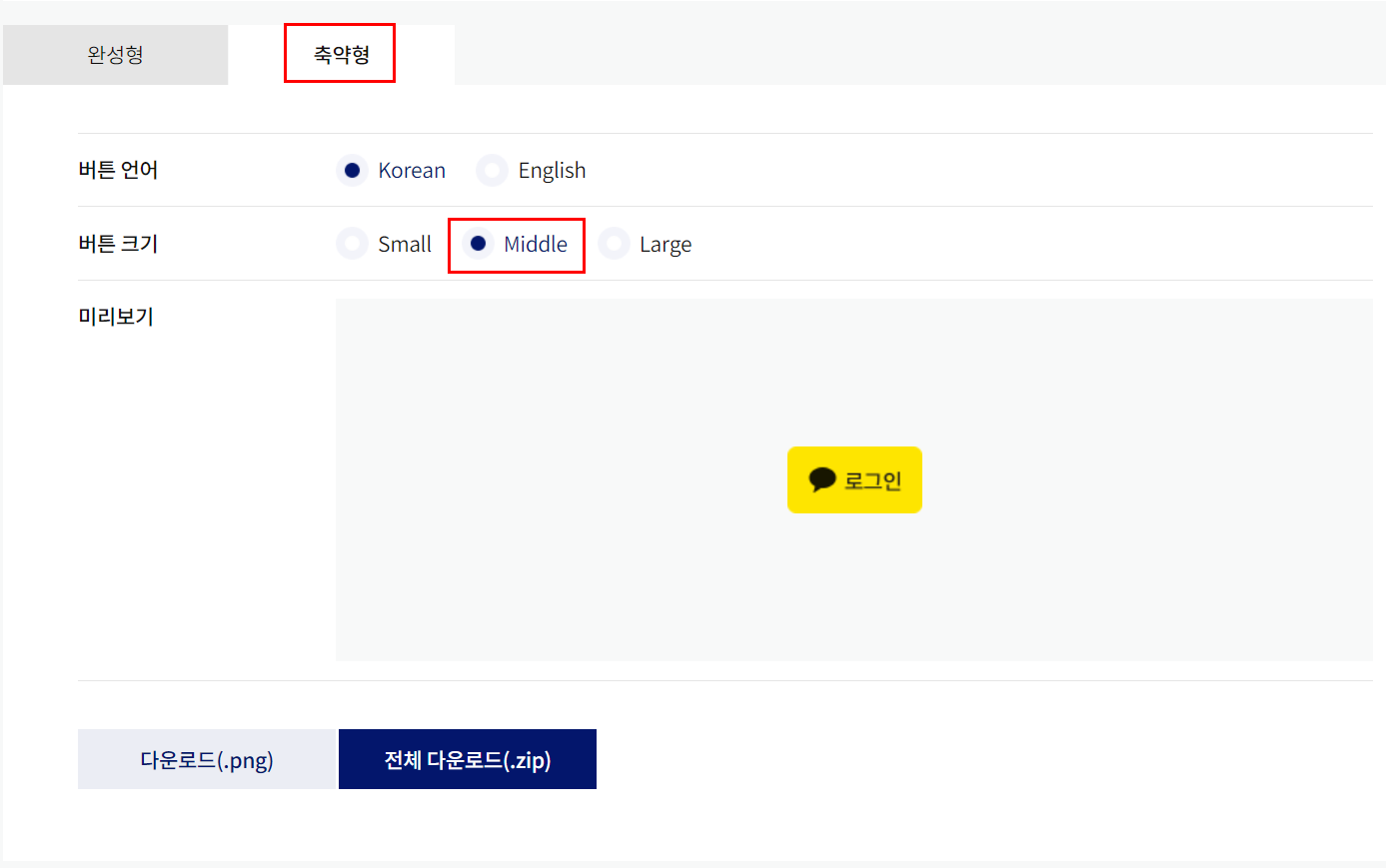 9. 이곳에서 카카오로그인 버튼 소스를 가져온다. (축약형, Middle)