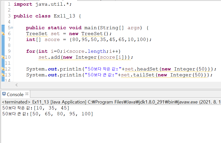 SortedSet headSet() : 지정된 객체보다 작은 값의 객체들을 반환