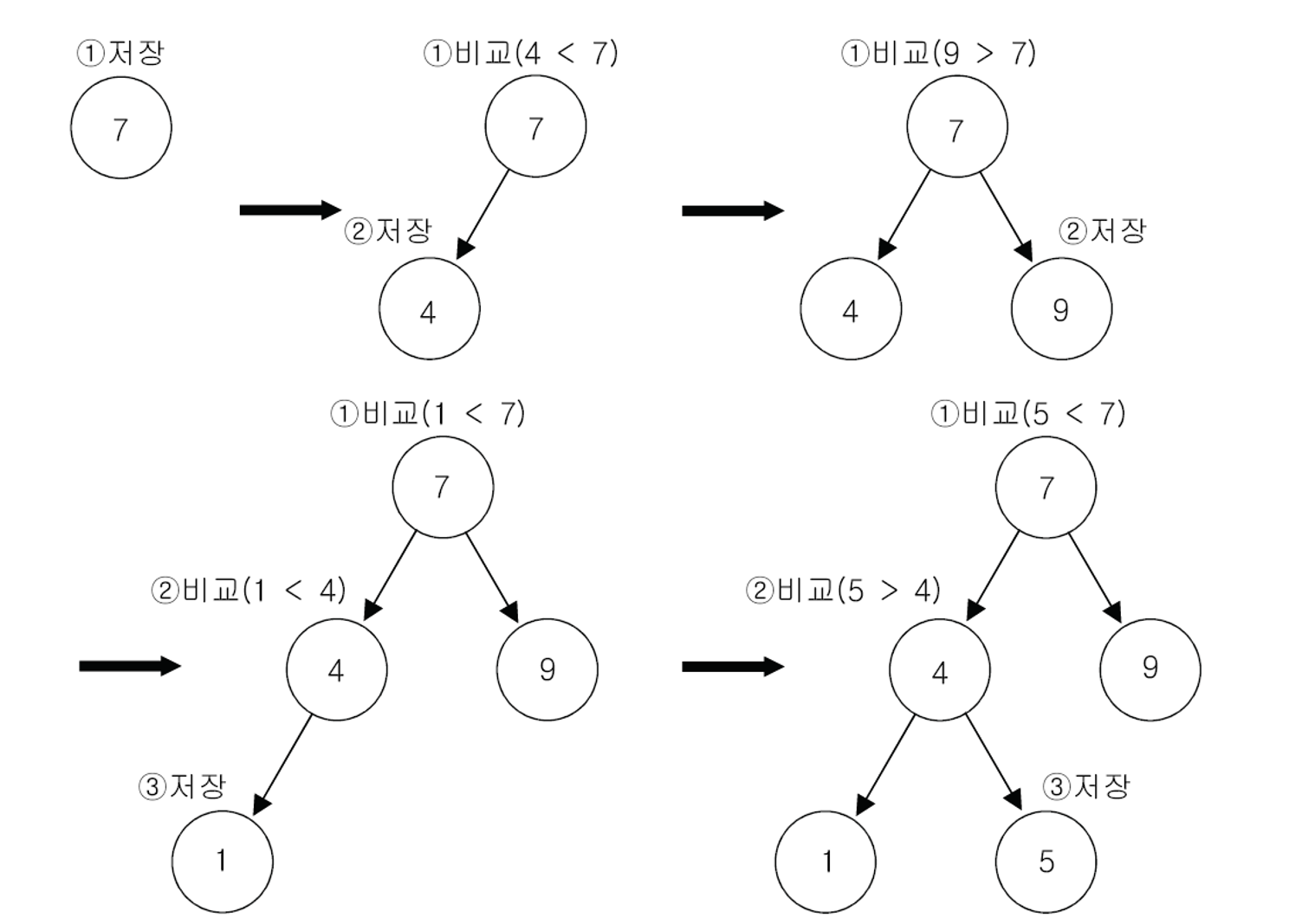 - 부모보다 작은 값은 왼쪽, 큰 값은 오른쪽에 저장