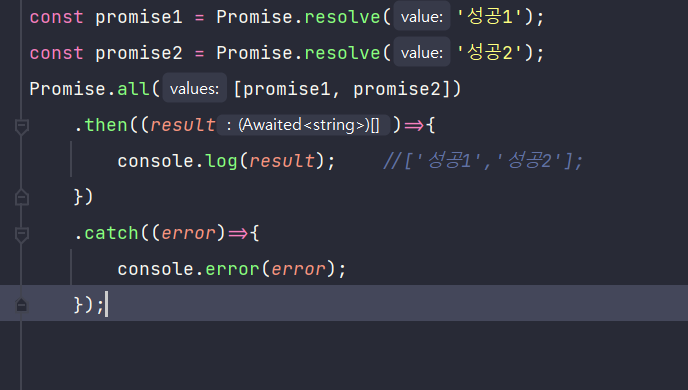 - 결과값은 실행 완료 후 then이나 catch메서드를 통해 받음.