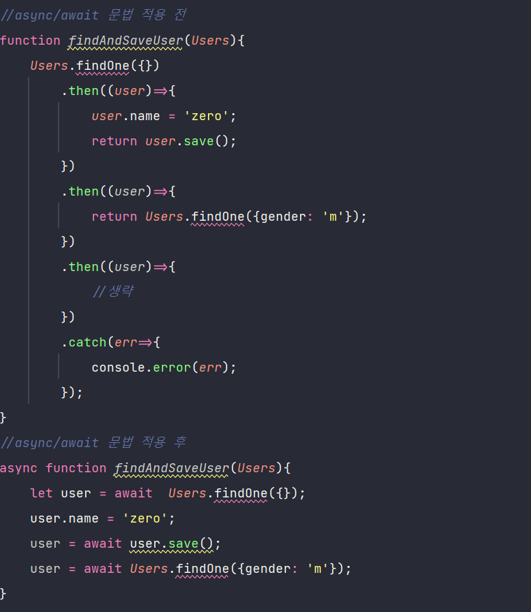 - 일반 함수 대신 async funcion으로 교체 후 프로미스 앞에 await을 붙여줌.