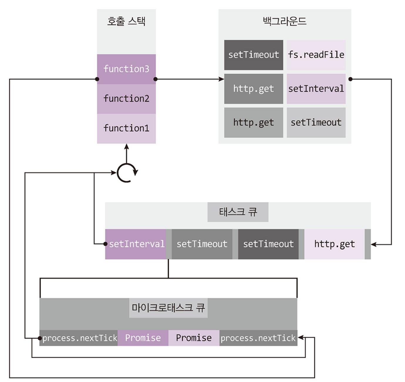 - 이렇게 우선시되는 process.nextTick과 Promise를 마이크로태스크(microtask)라고 따로 구분지어 부르기도함.