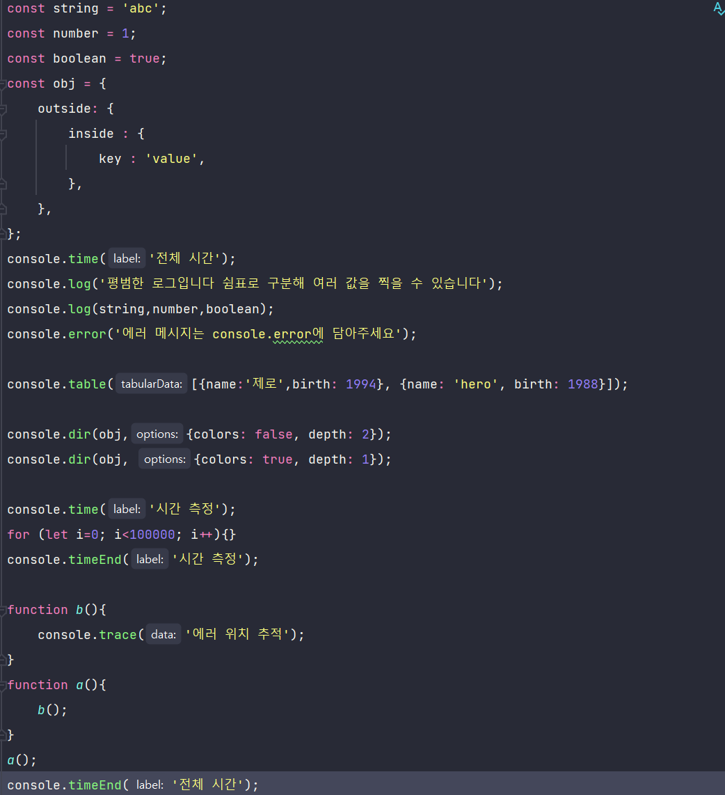 - console.time(레이블) : 같은 레이블을 가진 time과 timeEnd 사이의 시간을 측정함.