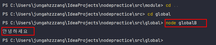 - globalB에서 넣은 global.message 값을 globalA에서도 접근 가능함을 보여줌.