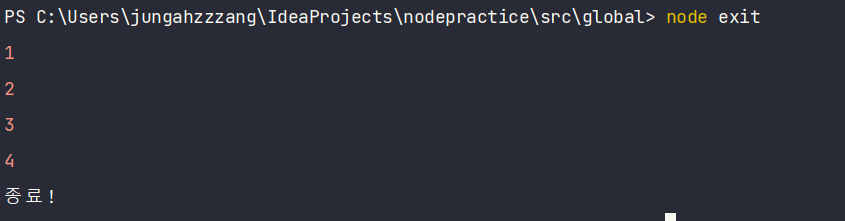 - process.exit(코드) : 실행 중인 노드 프로세스를 종료함. 서버 환경에서 exit 사용 시 서버가 멈추므로 잘 사용하지 않음.