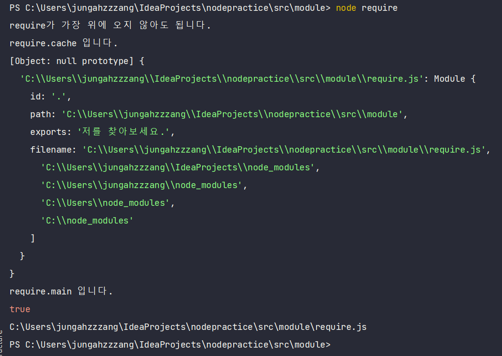 - require.cache 객체에 require.js 나 var.js같은 파일 이름이 속성명으로 들어있는 것을 확인할 수 있는데 속성값으로는 각 파일의 모듈 객체가 들어 있음. => 한 번 require한 파일은 require.cache에 저장되므로 다음 번에 require할 때는 새로 불러오지 않고 require.cache에 있는 것이 재사용됨.