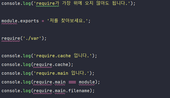 💡위 예제의 포인트는 require가 반드시 파일 최상단에 위치할 필요가 없고, module.exports도 최하단에 위치할 필요가 없다는 것. (=아무 곳에서 사용 가능)