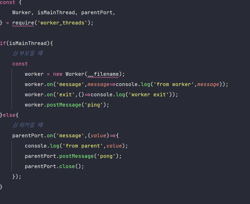 - 워커에서 on 메서드 사용 시 직접 워커를 종료해야함. -> parentPort.close()