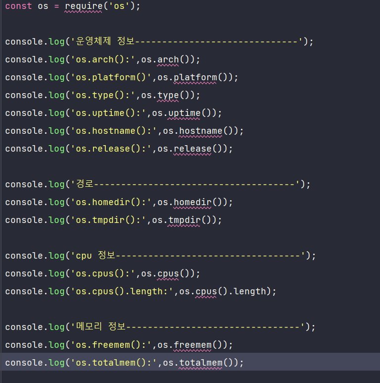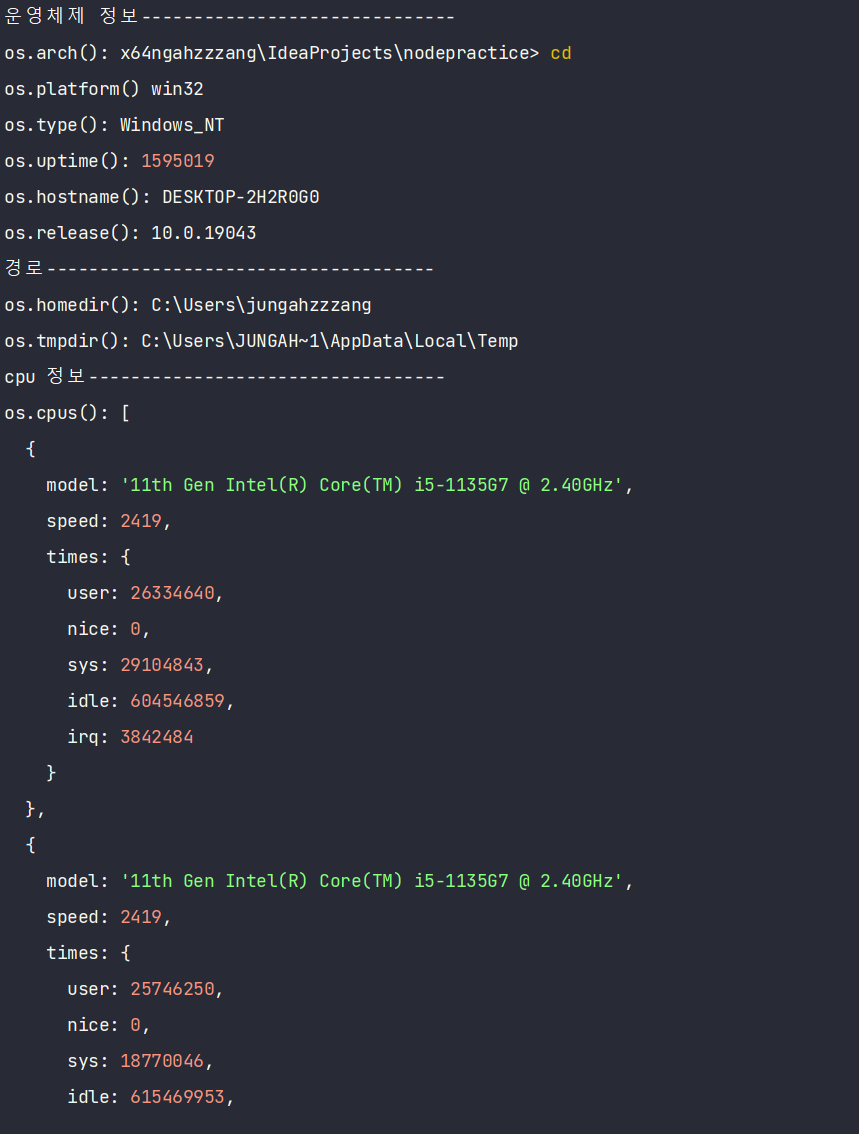 - os.uptime() : 운영체제 부팅 이후 흐른 시간(초)을 보여줌.