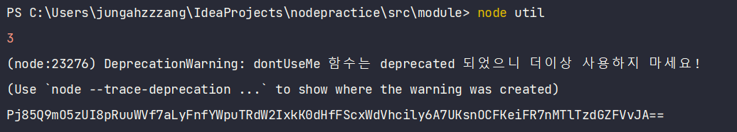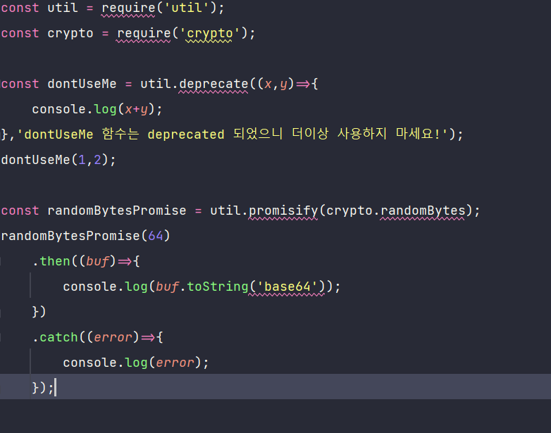 - util.deprecate : 함수가 deprecated 처리되었음을 알림. 첫 번째 인수로 넣은 함수 사용 시 경고 메시지가 출력됨.