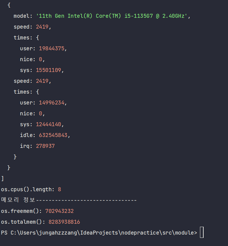 - os.cpus() : 컴퓨터 코어 정보를 보여줌