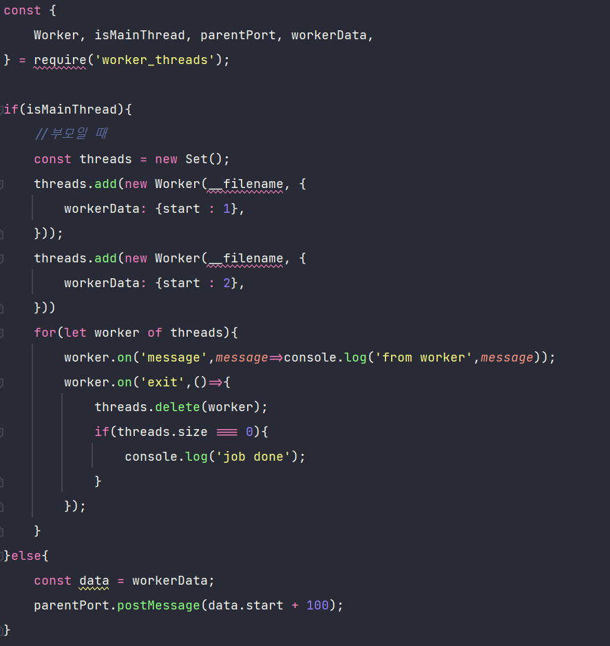 - 워커에서는 workerData로 부모로부터 데이터를 받음.