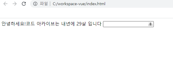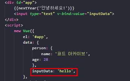 input 태그의 text 박스에 Vue에서 정의한 inputData 데이터를 바인딩해보면 hello가 잘 들어간다.