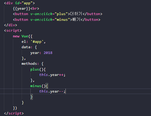 - 'v-on' 디렉티브, '@' 2가지를 사용해서 이벤트 핸들링 처리함.