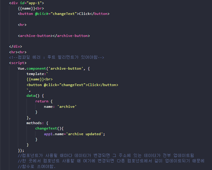 - 전역 컴포넌트는 뷰 라이브러리 로딩 후 접근 가능한 Vue 변수를 이용하여 등록함.