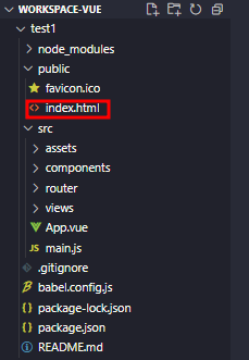 vue 설치 후 폴더 구조를 보면 아래와 같이 html 파일은 index.html 단 하나로 구성되어 있다.(SPA)