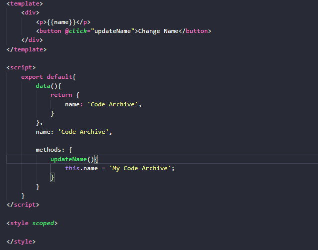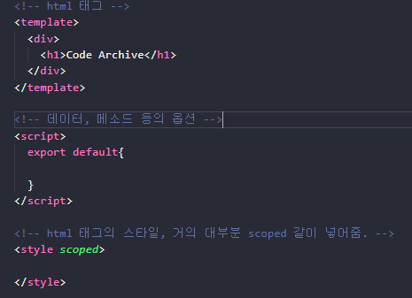 <style> 태그에 scoped라는 속성은 다른 컴포넌트 말고 해당 컴포넌트에만 스타일 속성을 적용하겠다는 뜻이다. 대부분 경우 scoped 속성을 함께 사용하고 있다.