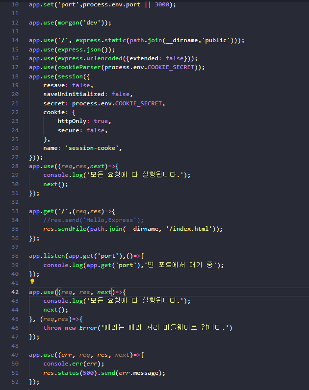 | app.use(미들웨어) | 모든 요청에서 미들웨어 실행 |