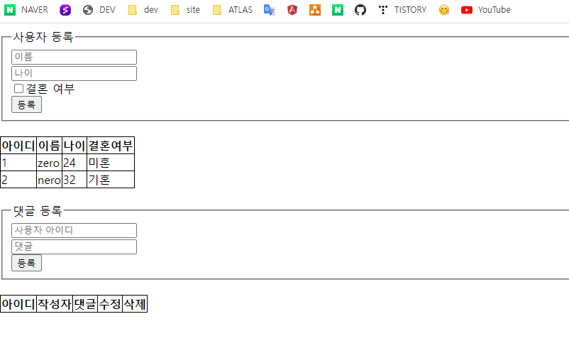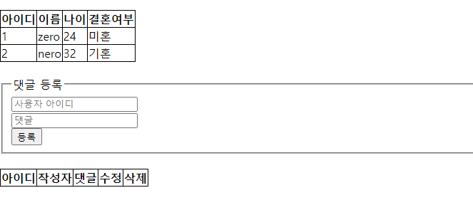 접속 시 GET/ 라우터에서 User.findAll 메서드를 호출하므로 그에 따른 SQL문이 실행되고 아래와 같은 화면이 나온다.