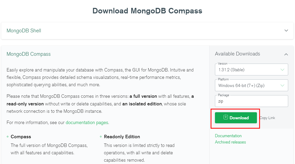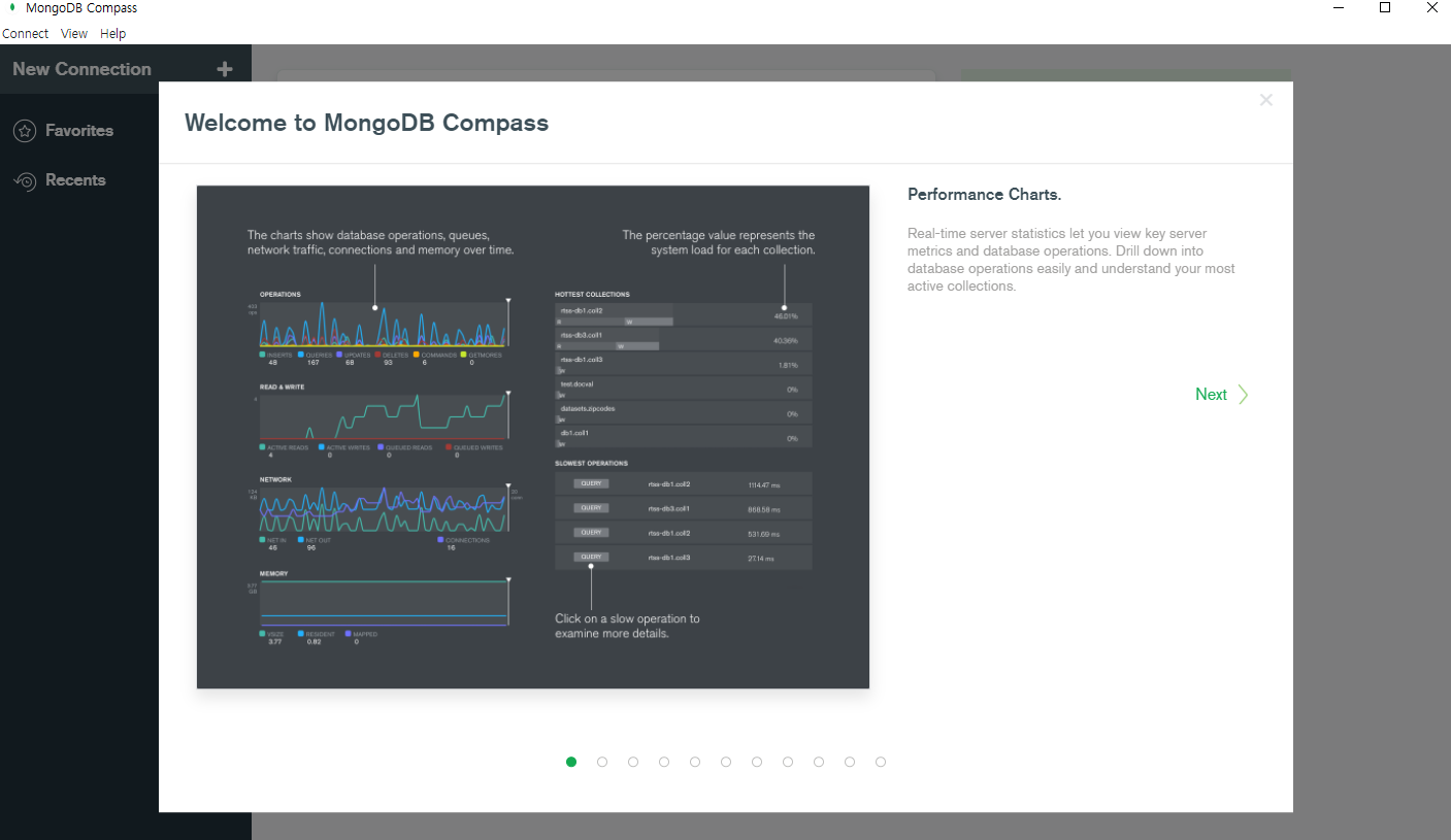 몽고디비는 관리 도구로 컴퍼스를 제공한다. 윈도우는 자동으로 설치가 되므로 따로 설치 안 해도 된다.