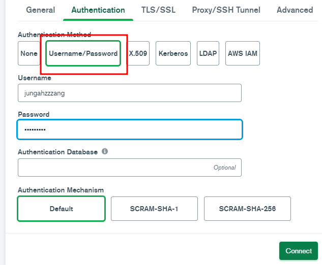 Authentication - Usename/Password로 변경하고 생성했던 Username, Password를 입력한다.