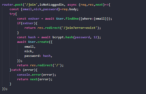 - 회원가입 라우터 : 기존에 같은 이메일로 가입한 사용자가 있는지 조회 후 있다면 회원가입 페이지로 되돌려보냄.
