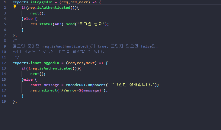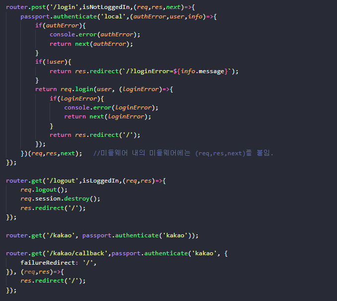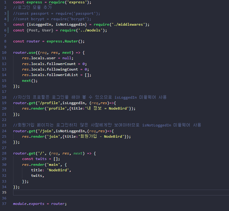 - 자신의 프로필은 로그인을 해야 볼 수 있으므로 isLoggedIn 미들웨어 사용, 회원가입 페이지는 로그인을 하지 않은 사람에게만 보여야 하므로 isNotLoggedIn 미들웨어 사용.