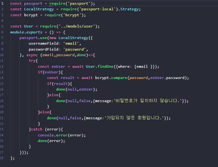 - 로그인 전략 구현 : 먼저 사용자 데이터베이스에서 일치하는 이메일이 있는지 찾은 후 있다면 bcrypt의 compare 함수로 비밀번호를 비교, 비밀번호까지 일치한다면 done 함수의 두 번째 인수로 사용자 정보를 넣어 보냄.