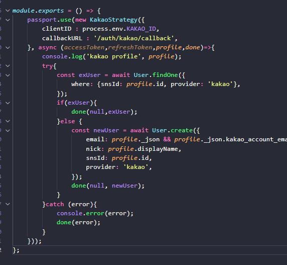 - 먼저 기존에 카카오를 통해 회원가입한 사용자가 있는지 조회, 있다면 이미 회원가입되어 있는 경우이므로 사용자 정보와 함께 done 함수 호출하고 전략을 종료함.