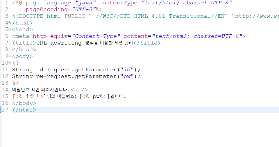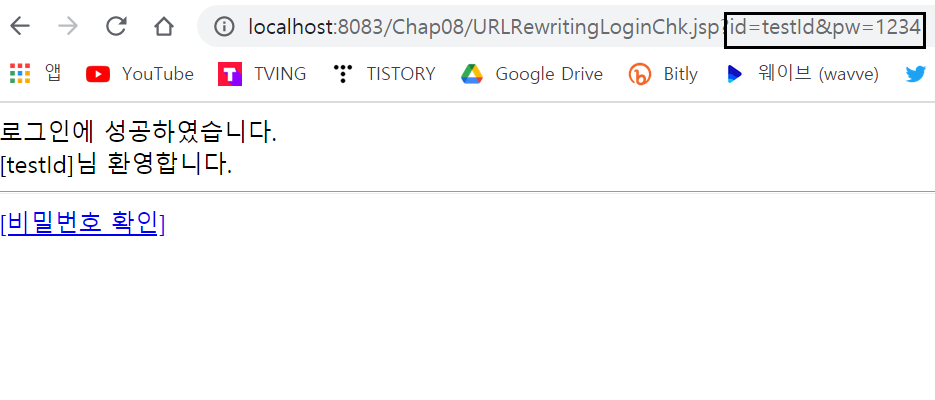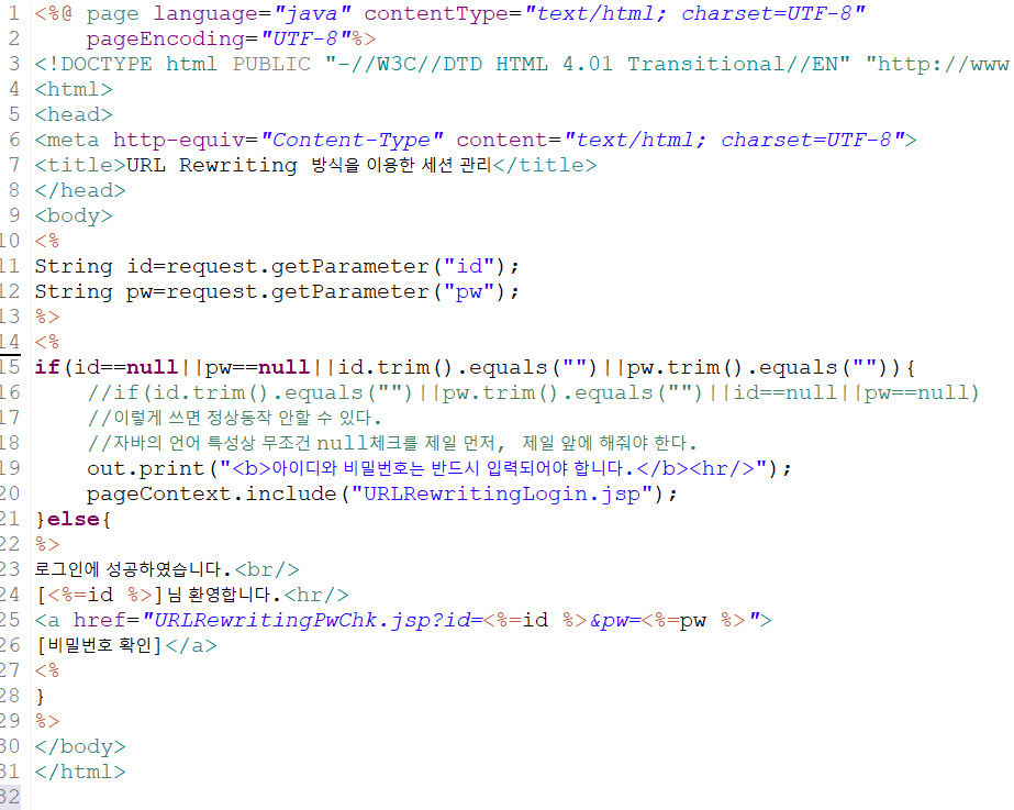 URLRewritingLogin.jsp 페이지를 통해 아이디와 비밀번호를 입력받아 로그인을 체크하는