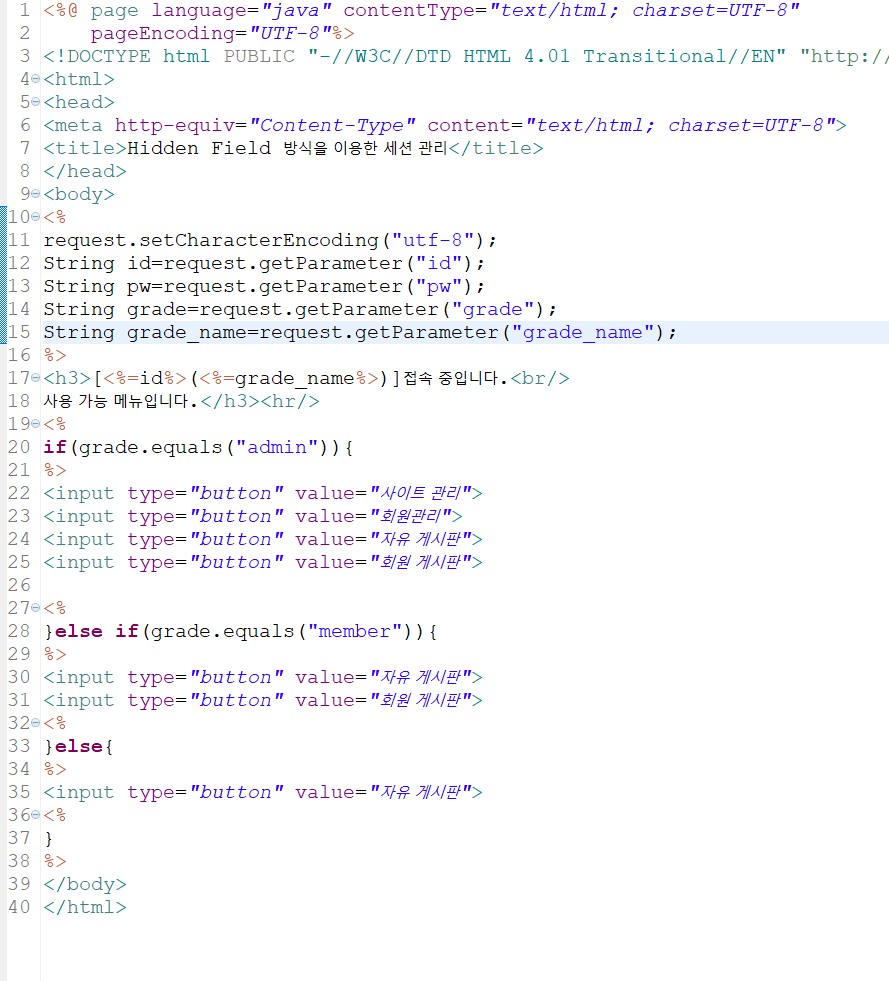 ->HiddenFieldMenu.jsp 페이지는 전달 파라미터 중 로그인 사용자의 권한 값이 저장된