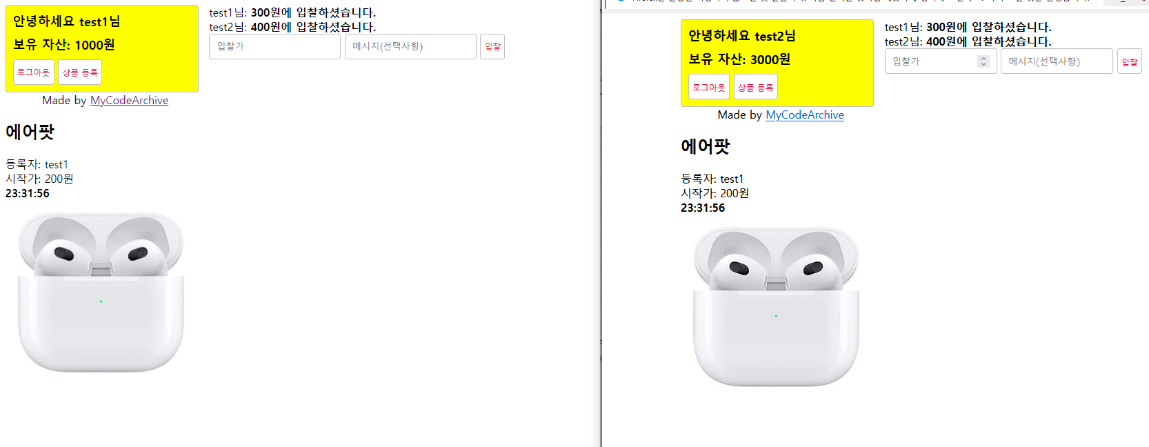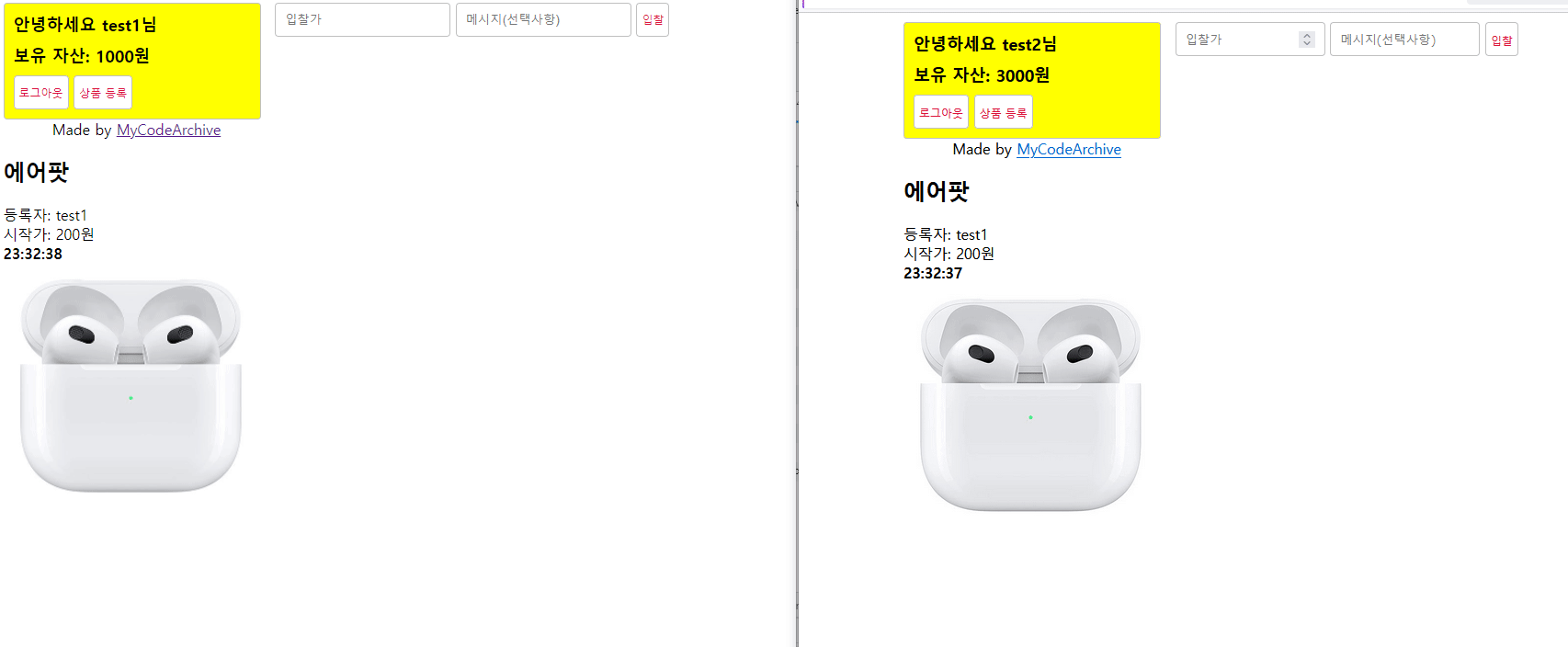 - 경매 화면에서 실시간으로 입찰 정보를 올리기 위해 웹 소캣 사용