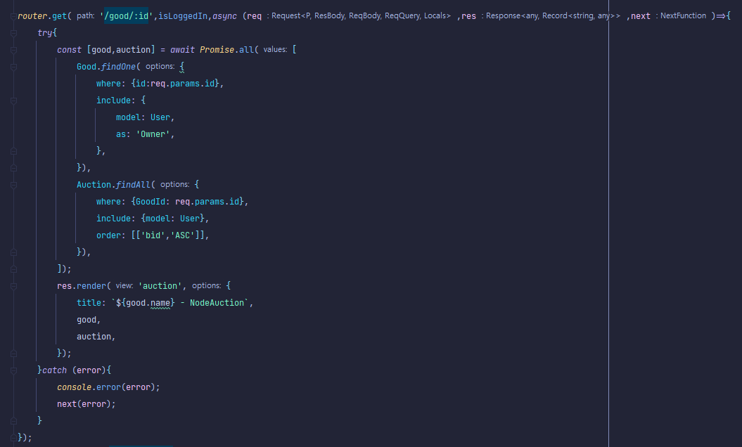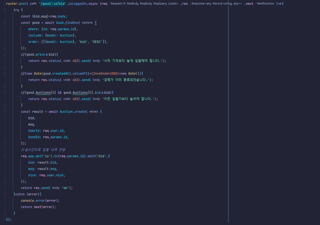 5. 라우터에 GET/good/:id , POST/good/:id/bid 추가