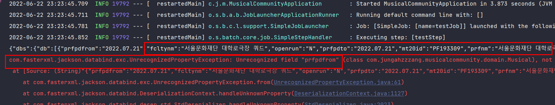 여기까지 코드를 작성하고 실행했을 때 json 형식으로 파싱은 잘 되었는데 에러가 발생했다.