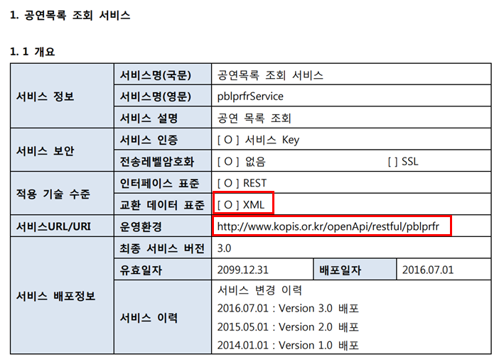 2. 그다음으로 사이트에 개발에 필요한 가이드라인이 올라와 있다. 나는 뮤지컬 목록을 불러올 것이므로 [공연 목록 조회 서비스] 가이드를 보고 따라하면 된다.