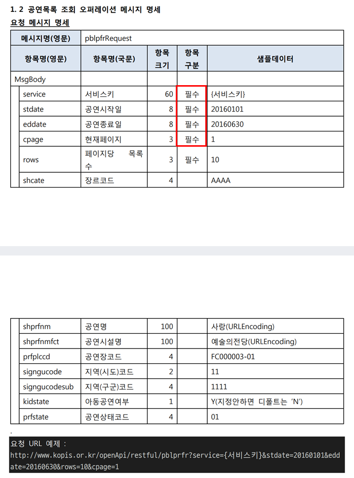 가이드대로 그대로 따라하기만 하면 되는데! 항목 구분에서 필수라고 적혀있는 항목은 URL에 꼭 포함시켜서 조회를 해주어야 한다. URL 형식은 요청 URL 예제대로 따라하면 된다.