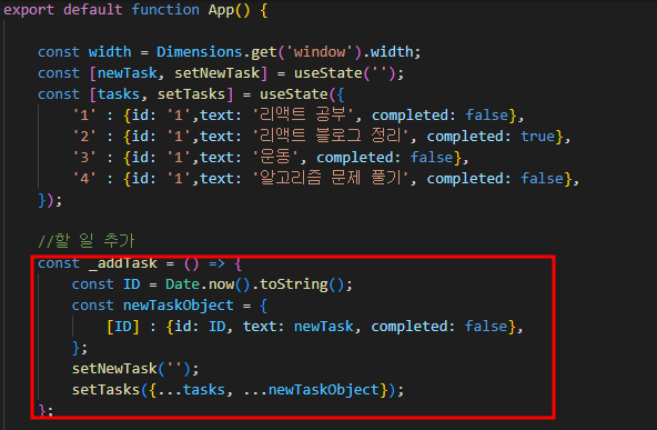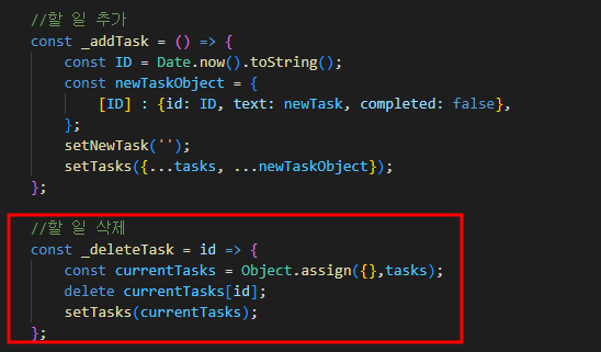_deleteTask : 삭제 버튼 클릭 시 항목 id를 이용하여 tasks에서 해당 항목을 삭제