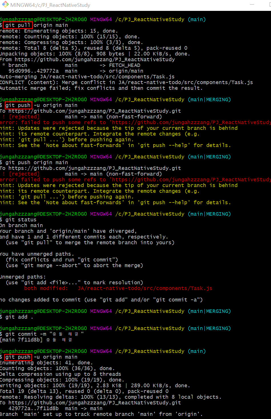 약간의 충돌이 있었지만 git pull로 해결하고 깃허브에도 커밋 완료