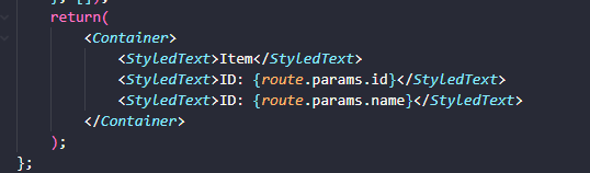 Item 화면으로 이동하면서 항목의 id와 name을 전달하도록 작성. 전달된 내용은 컴포넌트의 props로 전달되는 route의 params를 통해 확인 가능함.