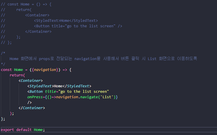 Home 화면에서 props로 전달되는 navigation을 사용해서 버튼 클릭 시 List 화면으로 이동하도록