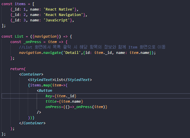 - navigation의 다양한 기능 중 navigate 함수는 원하는 화면으로 이동하는 데에 사용됨.