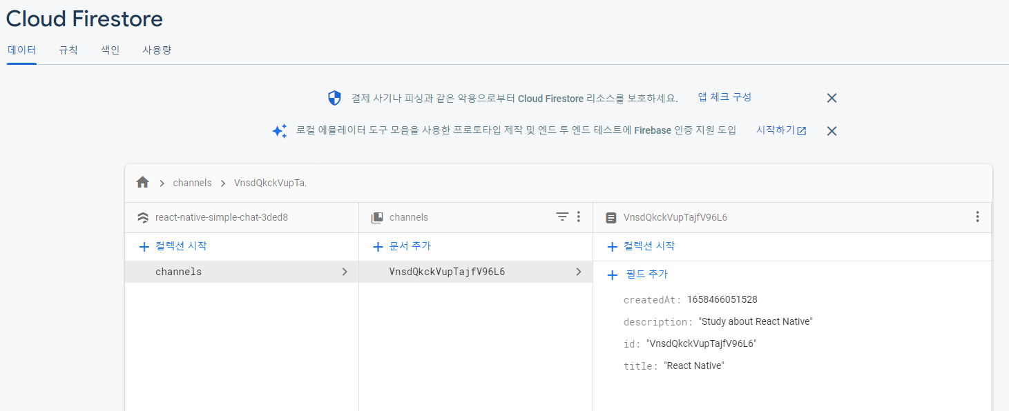 -컬렉션과 문서는 항상 유일한 ID를 가지고 있어야함. 이번 프로젝트에서는 channels라는 ID를 가진 하나의 컬렉션을 만들고 생성되는 채팅방을 channels 컬렉션에 문서로 저장 예정.