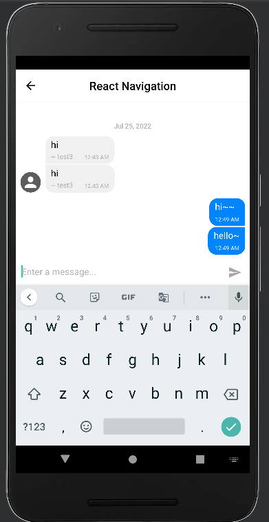 메시지를 주고받는 화면은 일반적인 모바일 화면과 스크롤 방향이 반대이므로 FlatList 컴포넌트의 inverted 속성을 활용하여 값에 따라 FlatList 컴포넌트를 뒤집은 것처럼 스크롤 방향 변경