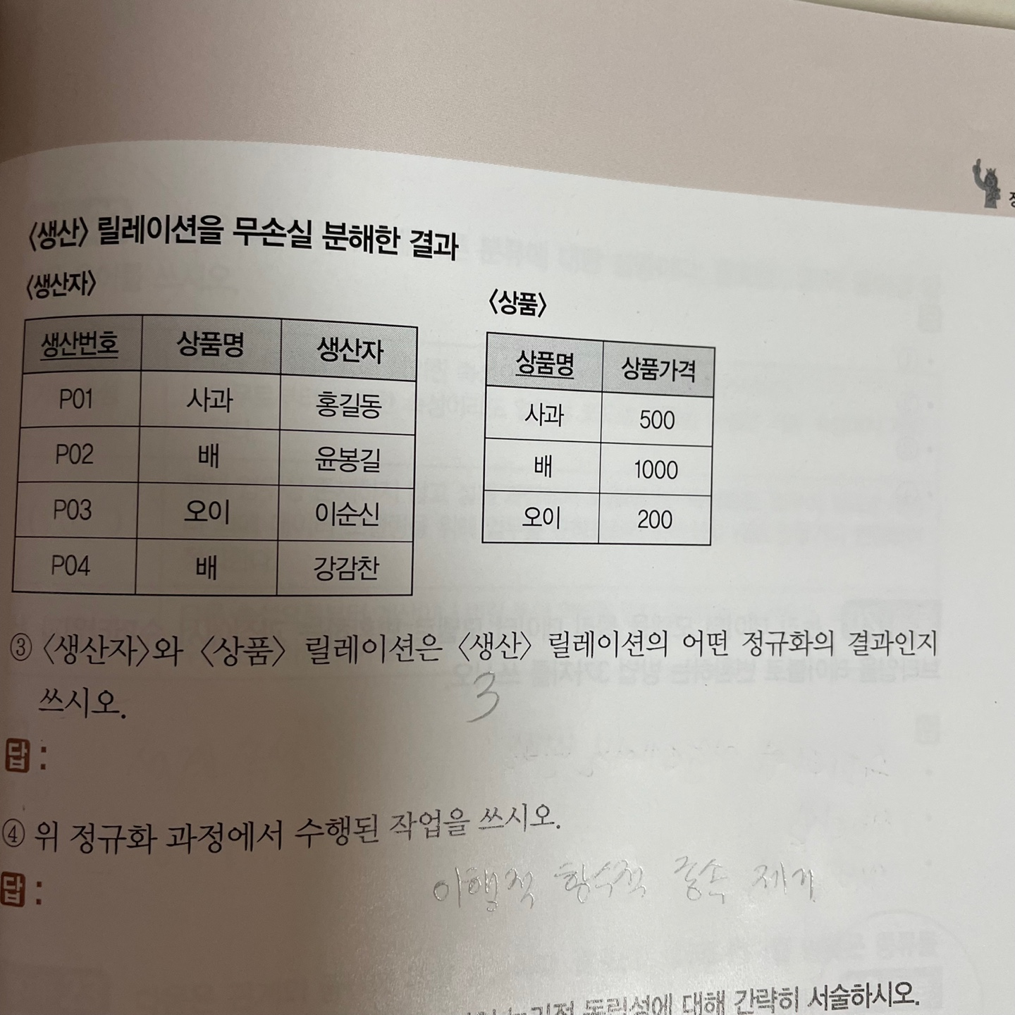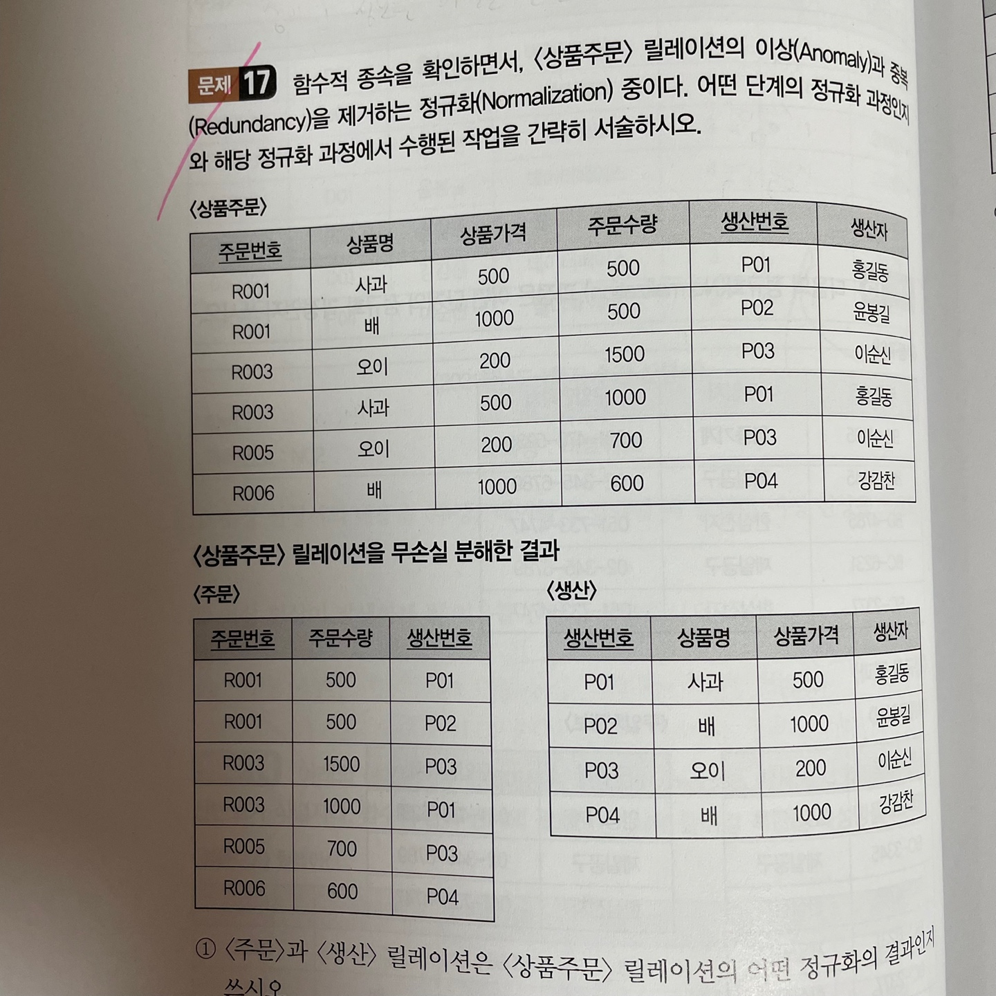 문제 17. 어떤 단계의 정규화 과정인지와 해당 정규화 과정에서 수행된 작업