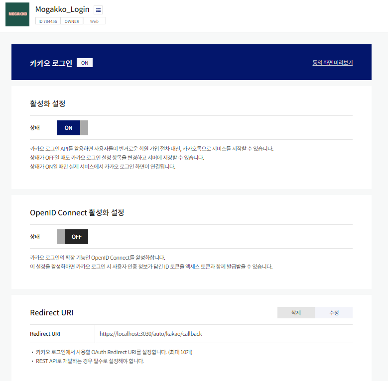 카카오 로그인을 활성화하고 리다이렉트 URI도 설정해 준다.